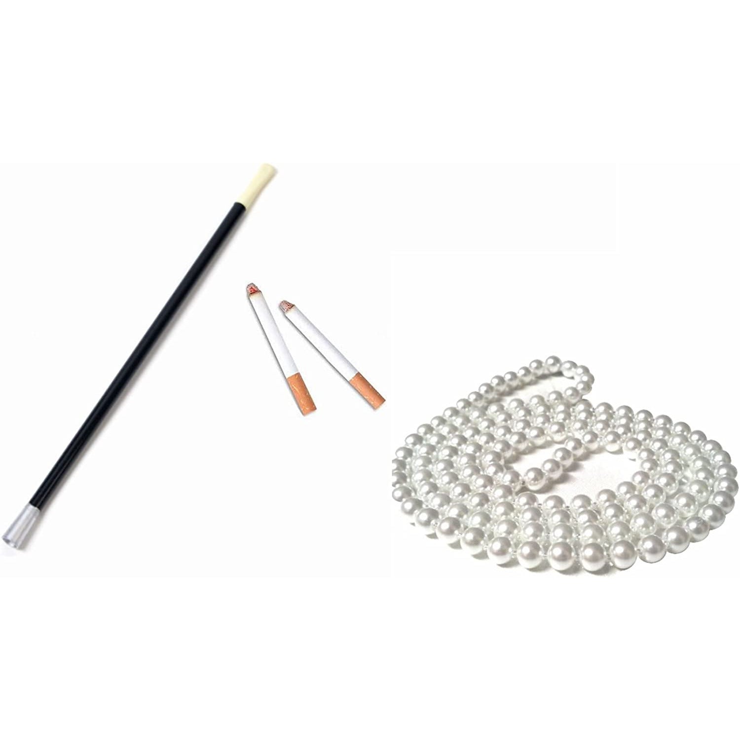 3 Piece Flapper Set Pearl effect Beads, Cigarette Holder and Fake Cigarettes Set includes:- 12″ Length Plastic Cigarette Holder 2 x Fake Cigarettes 48″ Pearl Bead Necklace (Plastic)