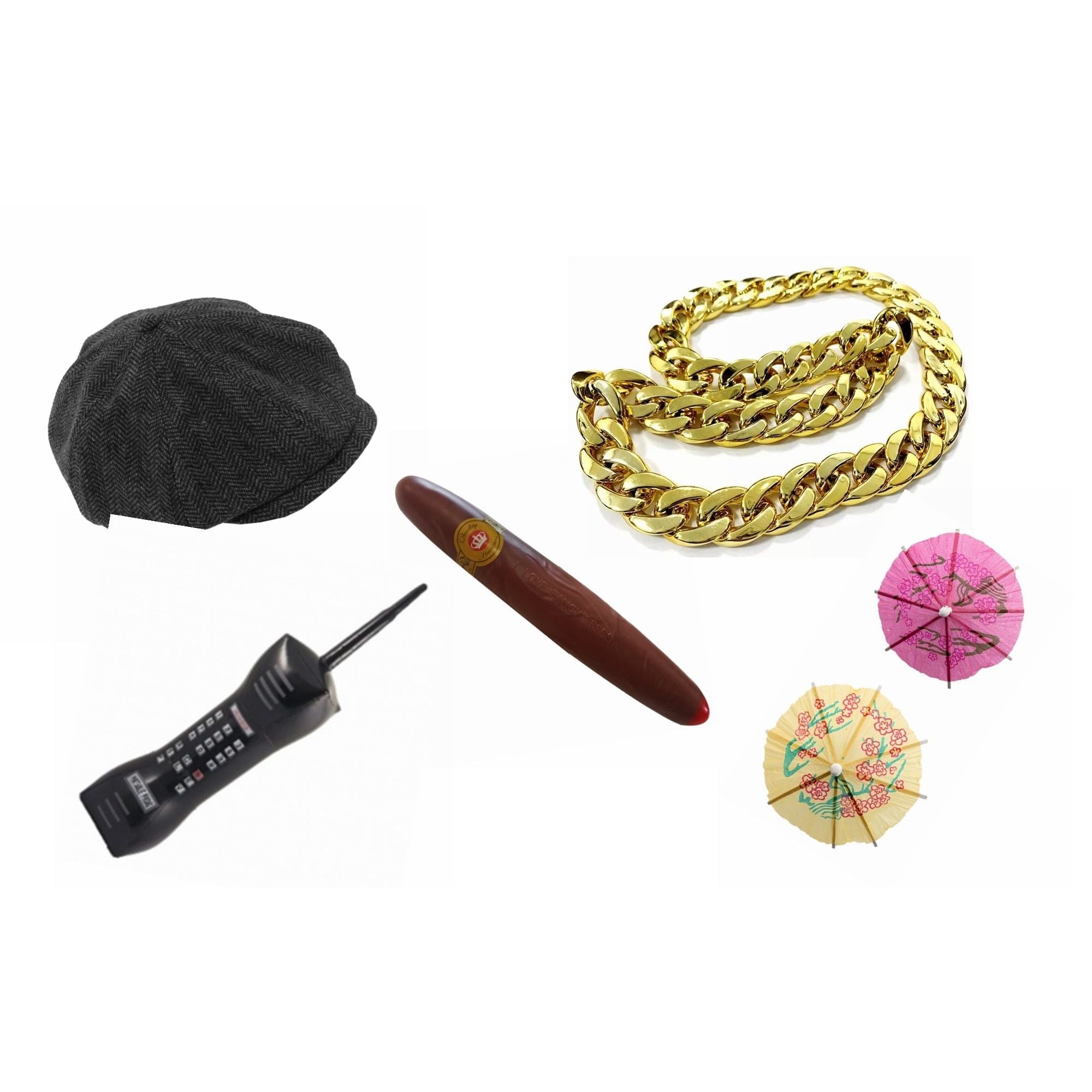 Do some dodgy dealings with this fun loving comedy character set Specifications 60cm Dark Grey Herringbone Peaked Cap (Wool Blend) 70cm Gold Coloured Chunky Necklace Plastic Jumbo Cigar 76cm Inflatable Retro Mobile Phone 2 x Paper Umberellas to finish off that Caribbean Stallion Cocktail…..Lovely Jubbly Go on, you know it make sense!