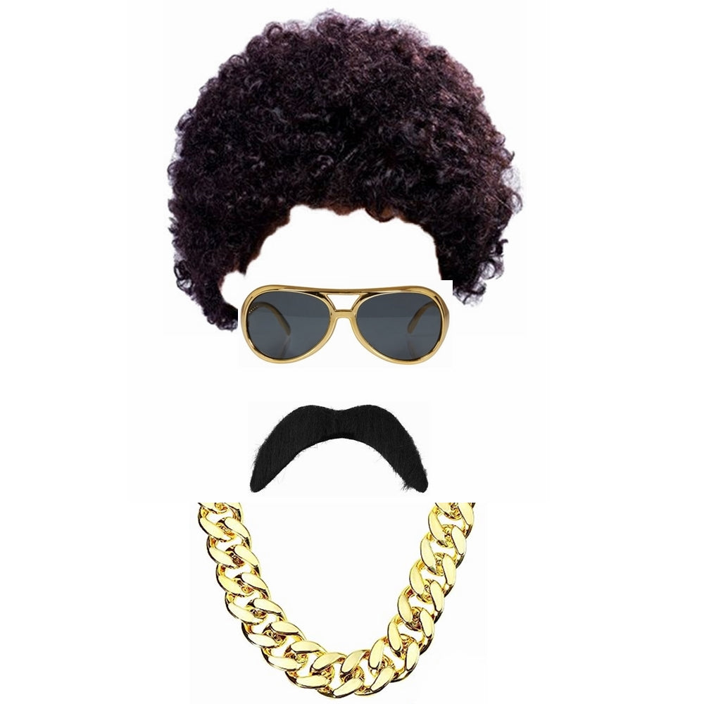 Control the 70s Dance Floor with this eye catching Retro Set Specifications Set Includes:- Black Afro Wig 100% Nylon One Size Adult Plastic Gold Coloured Framed Sunglasses Handlebar Moustache – Self Adhesive 70cm Plastic Gold Coloured Chunky Chain Perfect for 70s Parties, Stag Dos etc