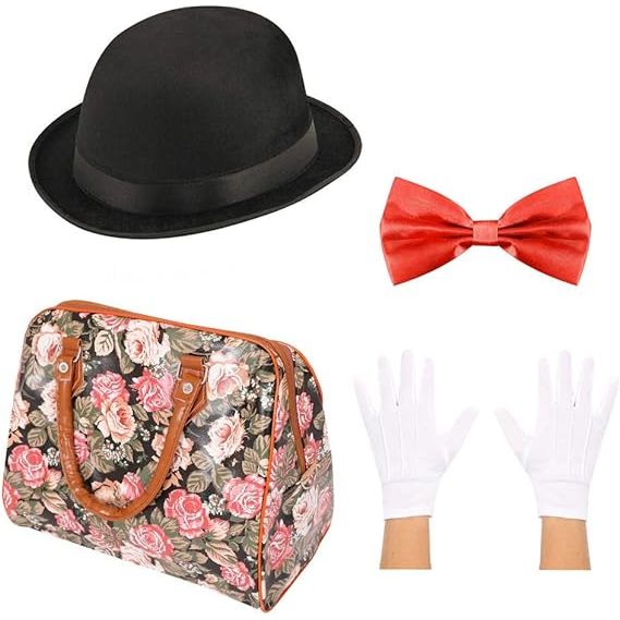 All Teachers, Be Practically Perfect this World Book Day! Specifications Set Includes: 58cm Carded Felt Bowler Hat, Red Pre-Tied Bow Tie & White Cotton Mix Gloves & Vinyl Tapestry Carpet Design Bag