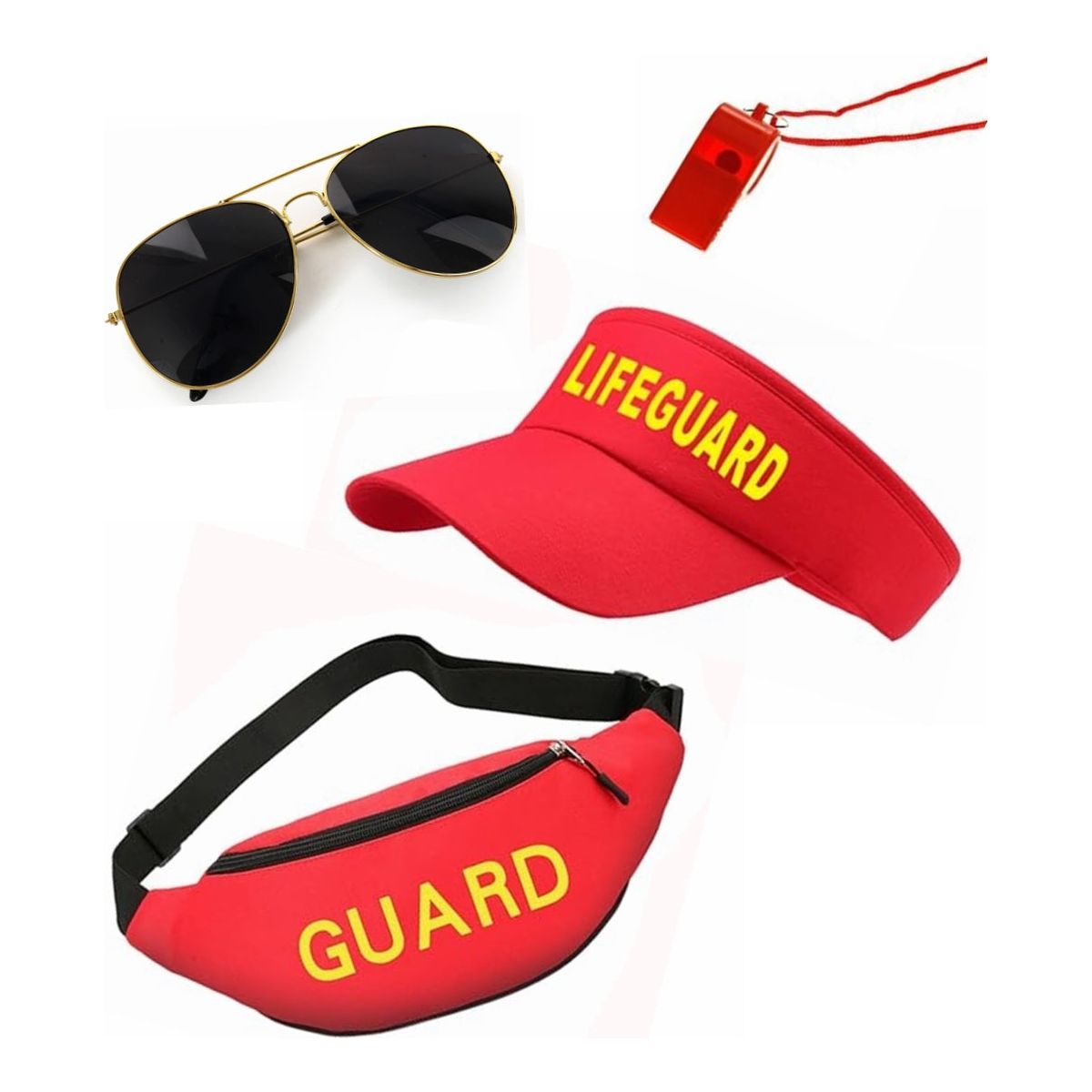 Prepare for lifesaving duties with this impressive ‘Lifeguard’ Set Specifications 100% Polyester Sun Visor & Bum Bag with Yellow ‘LIFEGUARD’ emblem Red Plastic Whistle Aviator-Style Sunglasses Perfect for group holiday fun, Stag Dos etc