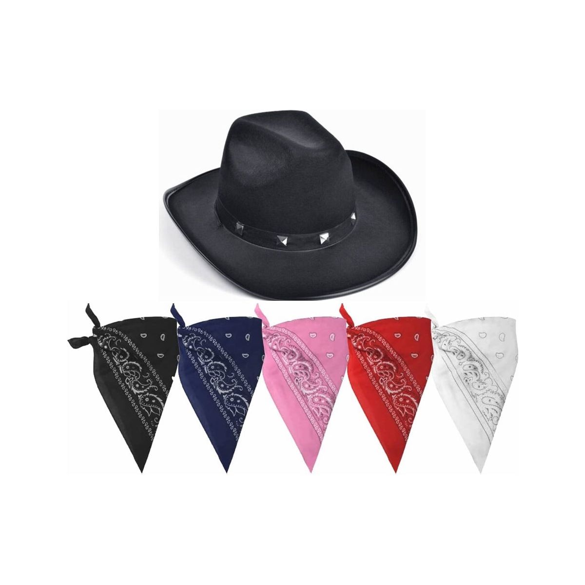 Cowboys take your partner in style with this impressive Black Stetson Hat & choice of Bandana Set. Specifications Quality Hard Felt Hat with Silver Star Studded Band Adjustable Neck Strap Head Size: 58cm (approx) 100% Cotton Bandana with Paisley Design Available Colours:- Red White Black Blue Pink
