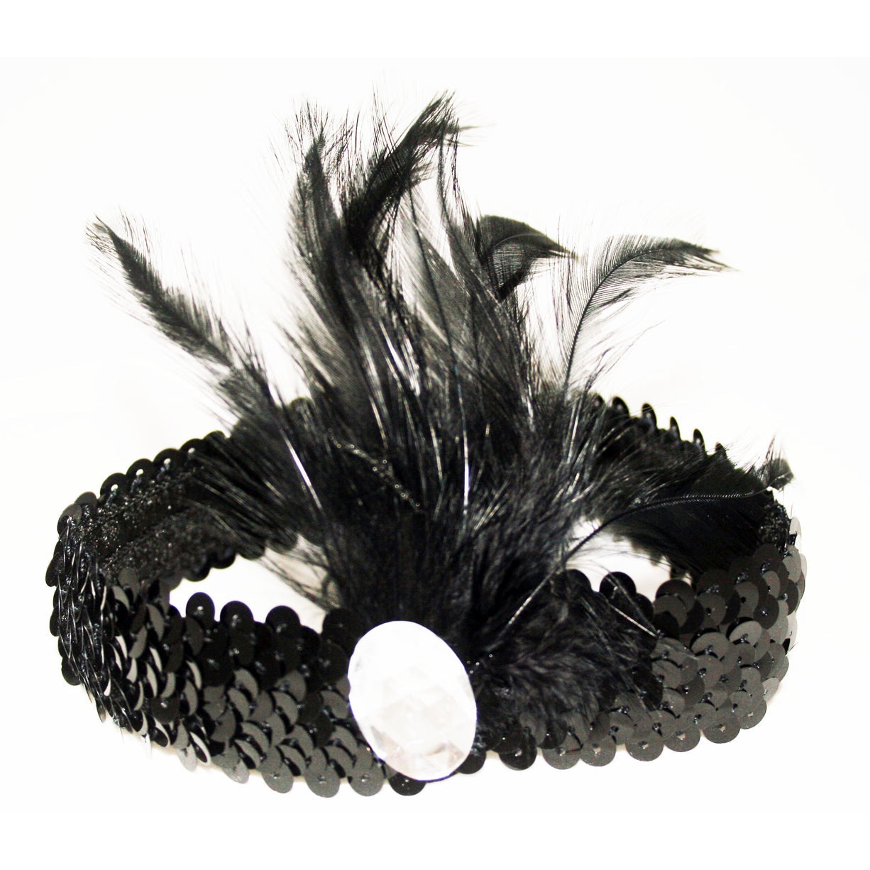 Complete your Great Gatsby outfit with this attractive Sequined Headband with jewel detail. Specifications Elasticated Black Sequined Headband with Feather One size fits most