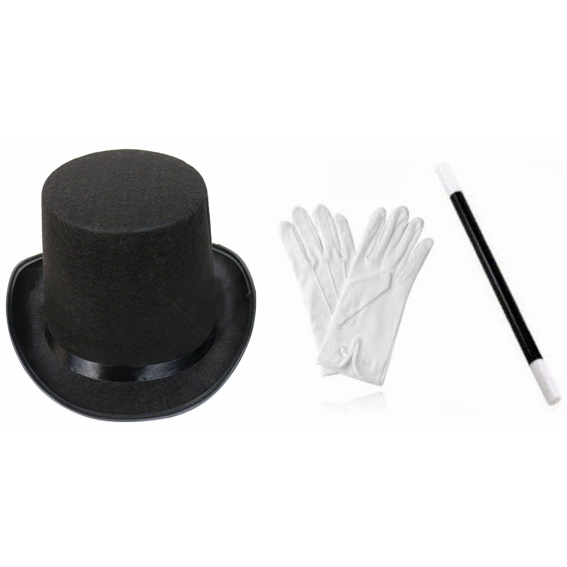 Join the Magic Circle with these quality Fancy Dress Accessories. Specifications Set includes 55cm Black Carded Top Hat with Satin Trim Plastic Magic Wand Child’s White Stretch Short Gloves