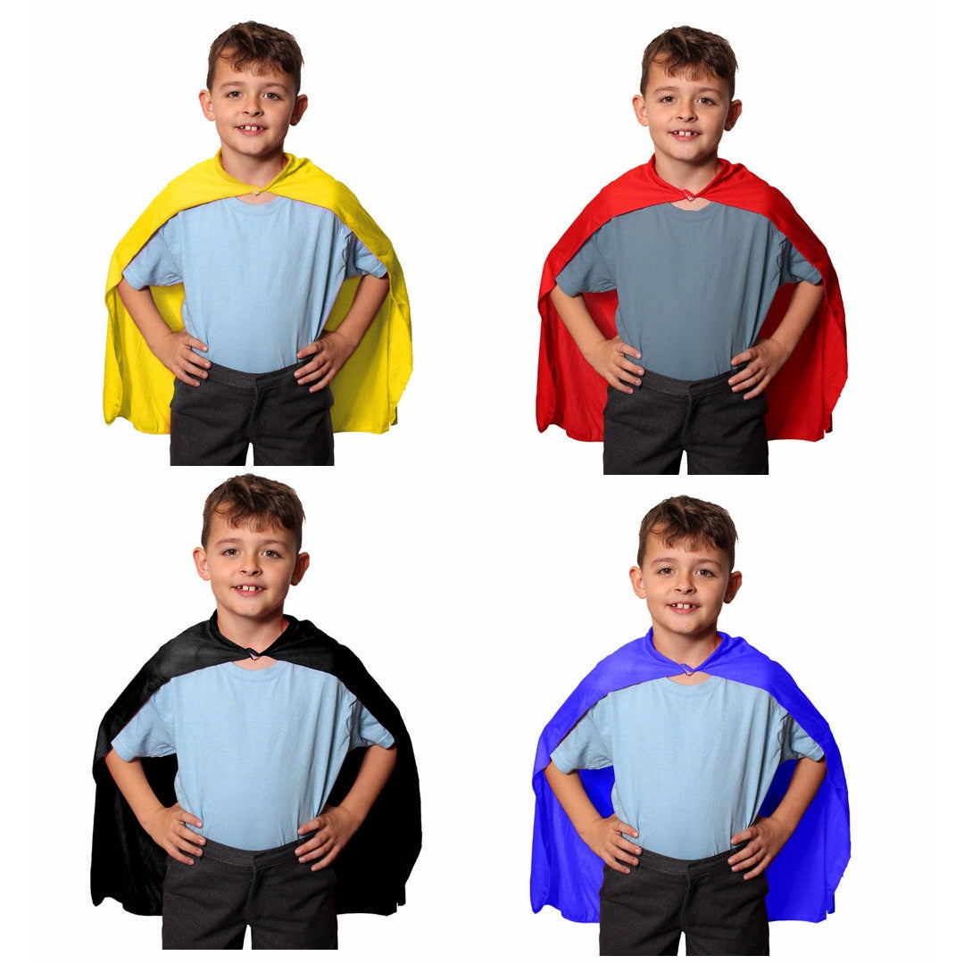 Take on your super powers with one of these colourful capes Specifications Available in 4 colours – Red, Black, Yellow & Blue Length – 27 inch long 100% Polyester View our store for matching or contrasting masks