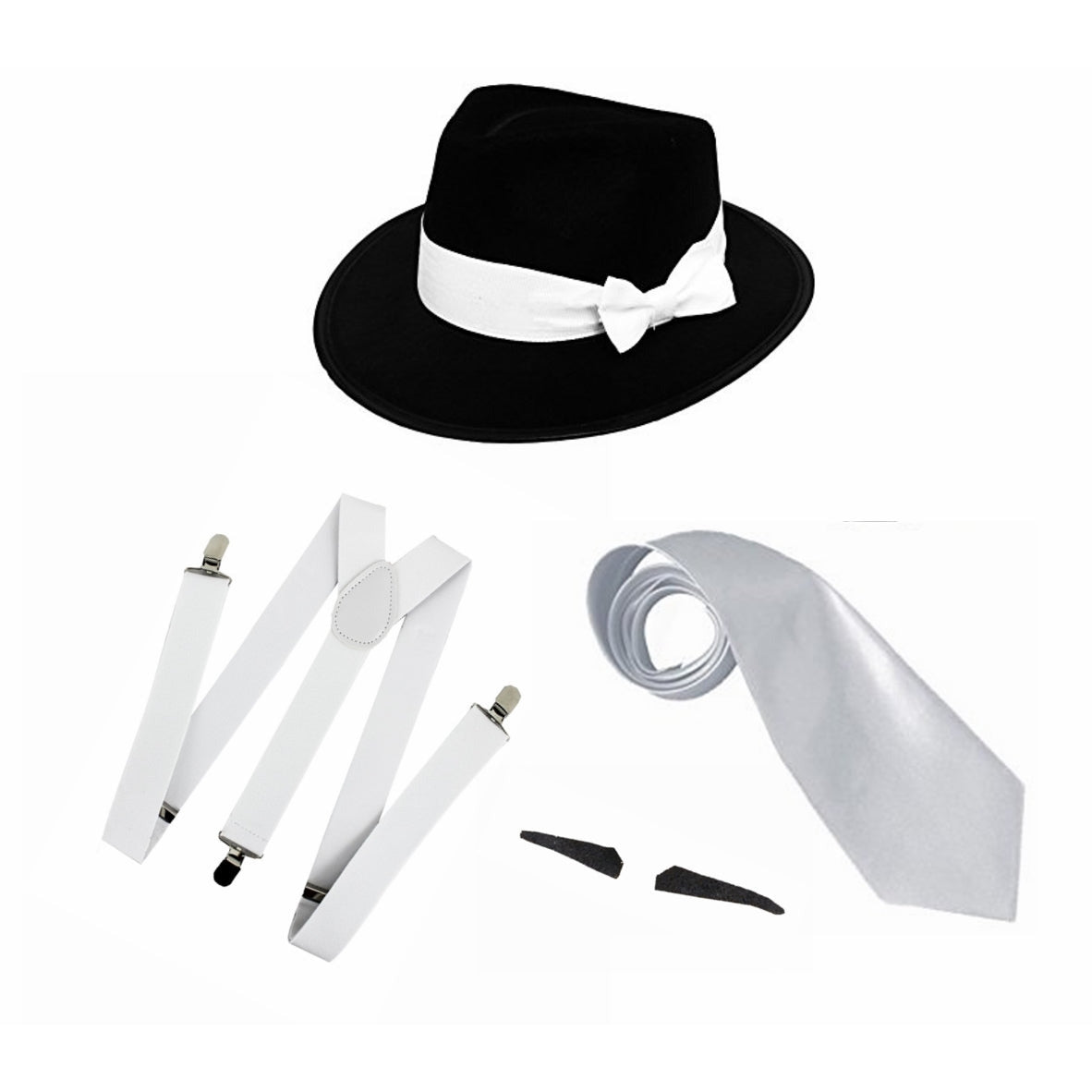 Gangster Set including Black Hat, White Tie, White Braces & Spiv Moustache Specifications One size fits all