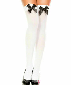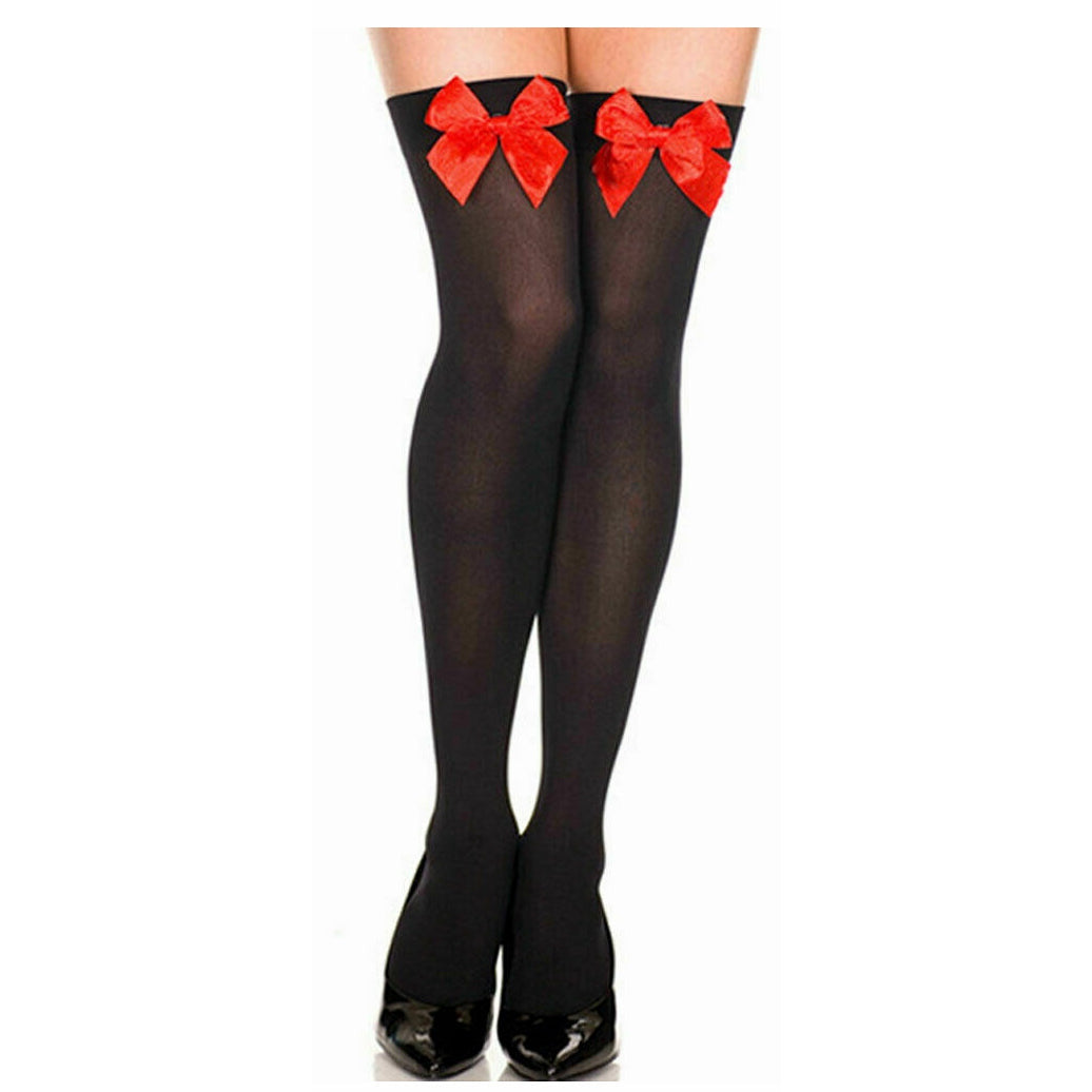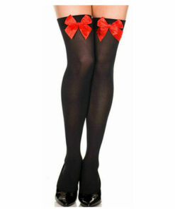Sexy Hold Up Stockings, perfect for St Trinians, Sexy Santa etc Specifications 100% Nylon Tights with Satin-Effect Bow Available Colours – White with Red Bow, White with Black Bow, Black with Red Bow, Black with White Bow
