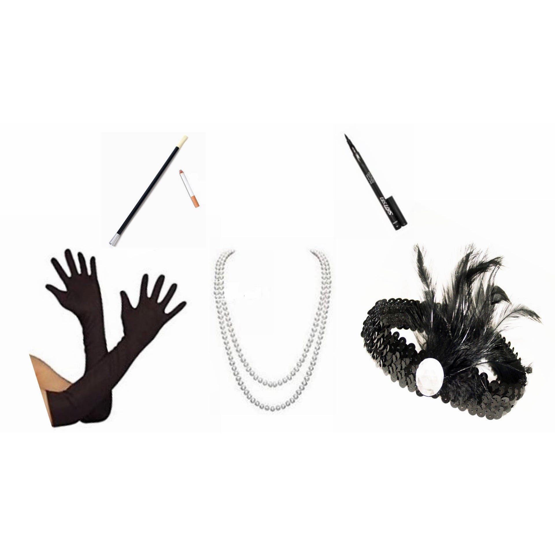 Perfect accessories for your Flapper Fancy Dress Outfit. Specifications Set Includes Black Sequined Elasticated Headband 12inch Extended Plastic Cigarette Holder 2 x Fake Cigarettes Long Black Satin-Effect Flapper Gloves 48 inch Plastic Pearl Beads Black Eyeliner Pen for eyes and the essential beauty spot