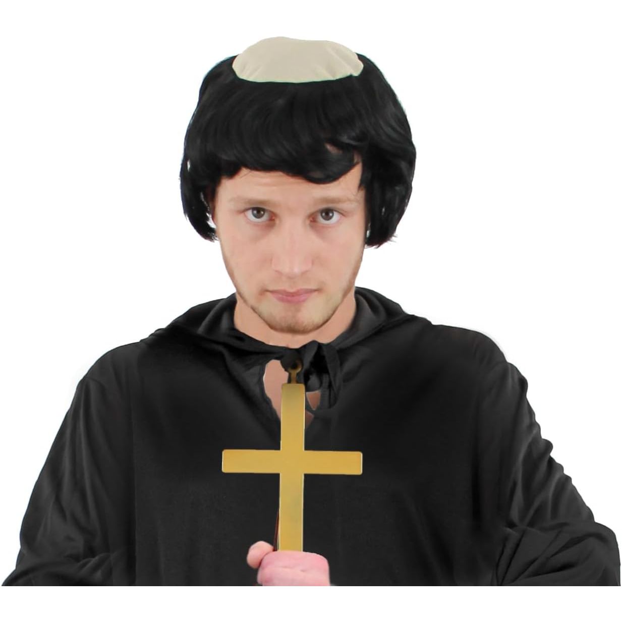 Men’s Monk Balding Wig with a Gold coloured Cross Specifications: Adult – One Size – Fits most Balding Wig with Cloth Patch – 100% Acrylic Gold Coloured Plastic Cross on a Cord – Lightweight Perfect for Friar Tuck, Monk Fancy Dress