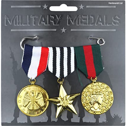 These pretend medals are a great accessory to finish off a military themed costume Specifications Set of 3 Military Medals Supplied with pin for attaching medals to clothing Ribbon made from polyester, medals made from plastic Suitable for adults and older children